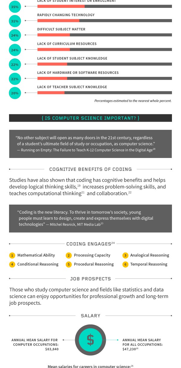 In this infographic, DataScience@SMU explores the state of computer science and coding education for K-12 students around the world and in the United States, the challenges to bringing computer science education to American students, and the cognitive and social benefits of a society where more kids are fluent in code. Help raise awareness of the importance of coding and bringing the United States into the 21st century in computer science education by sharing this graphic.